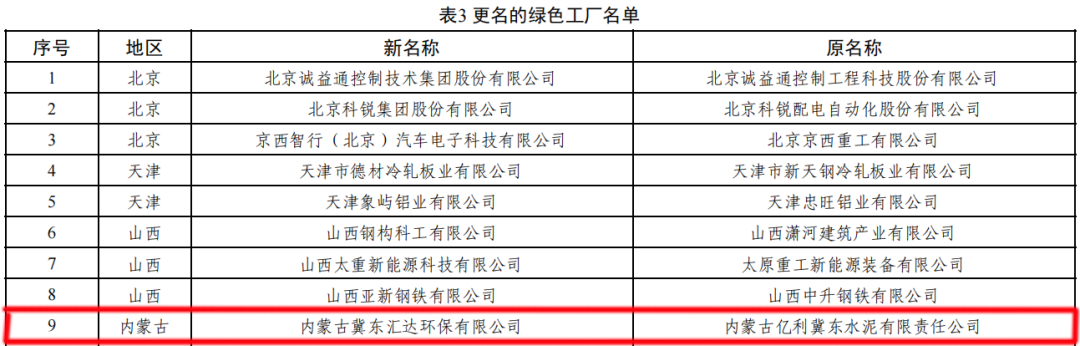 根据名单,59家水泥企业入选《2025年度绿色工厂名单》。另外,内蒙古亿利冀东水泥有限责任公司更名为内蒙古冀东汇达环保有限公司。